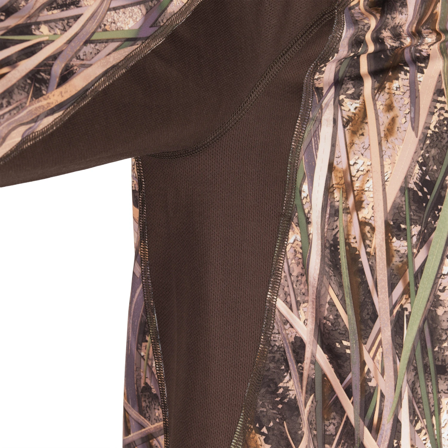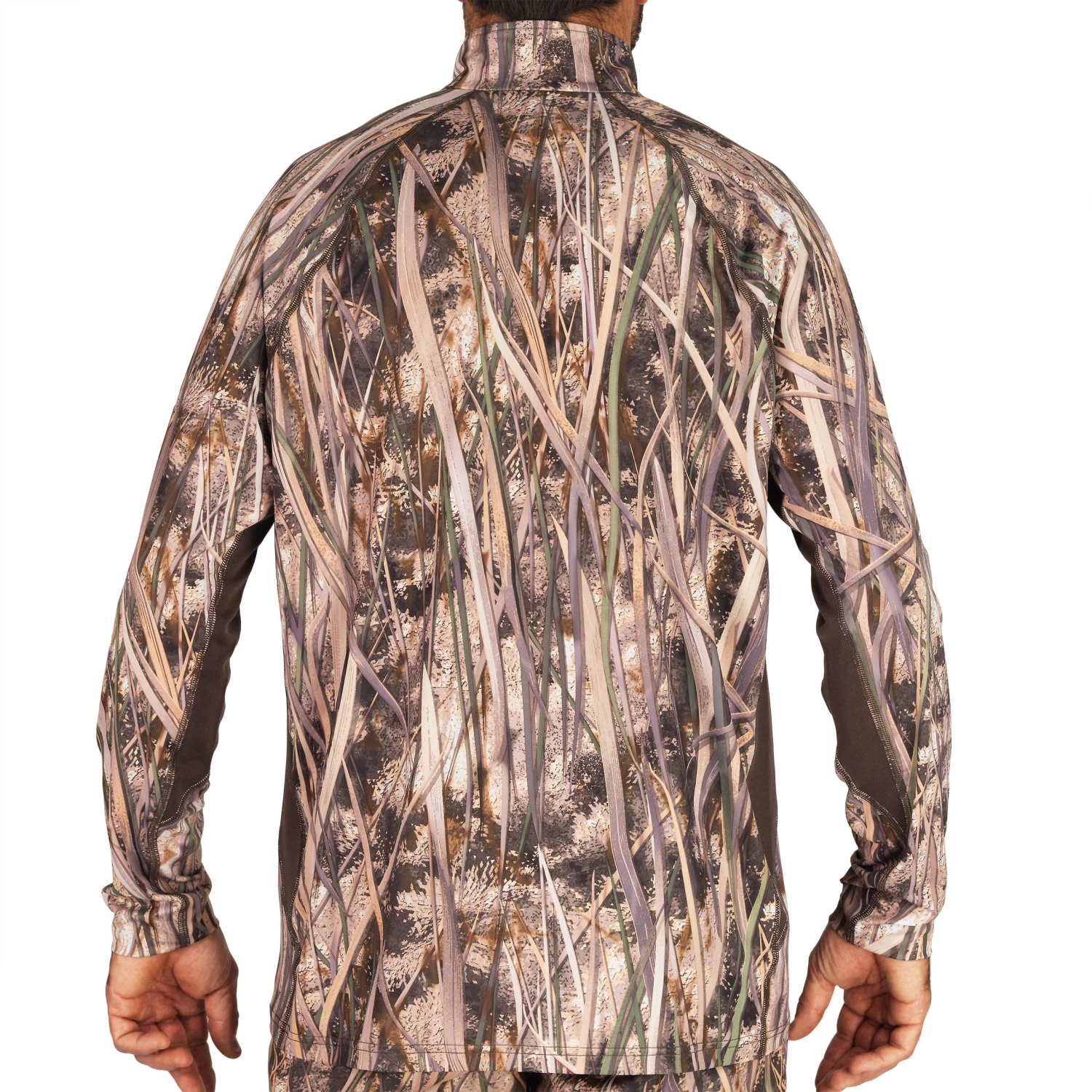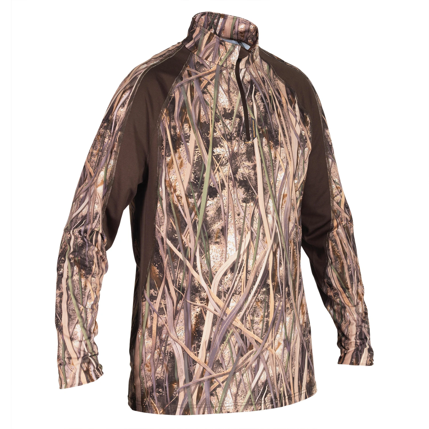 This long-sleeved T-shirt, designed for game and waterfowl hunters, uses the exclusive SOLOGNAC wetlands camouflage for greater stealth in the eyes of ducks, geese and teals. With its ultra-realistic pattern of vegetation (rush, grass, reeds), a distinct 3D effect, and a high contrast between the light and dark shades, this T-shirt lets you blend into any environment where waterfowl are hunted.
