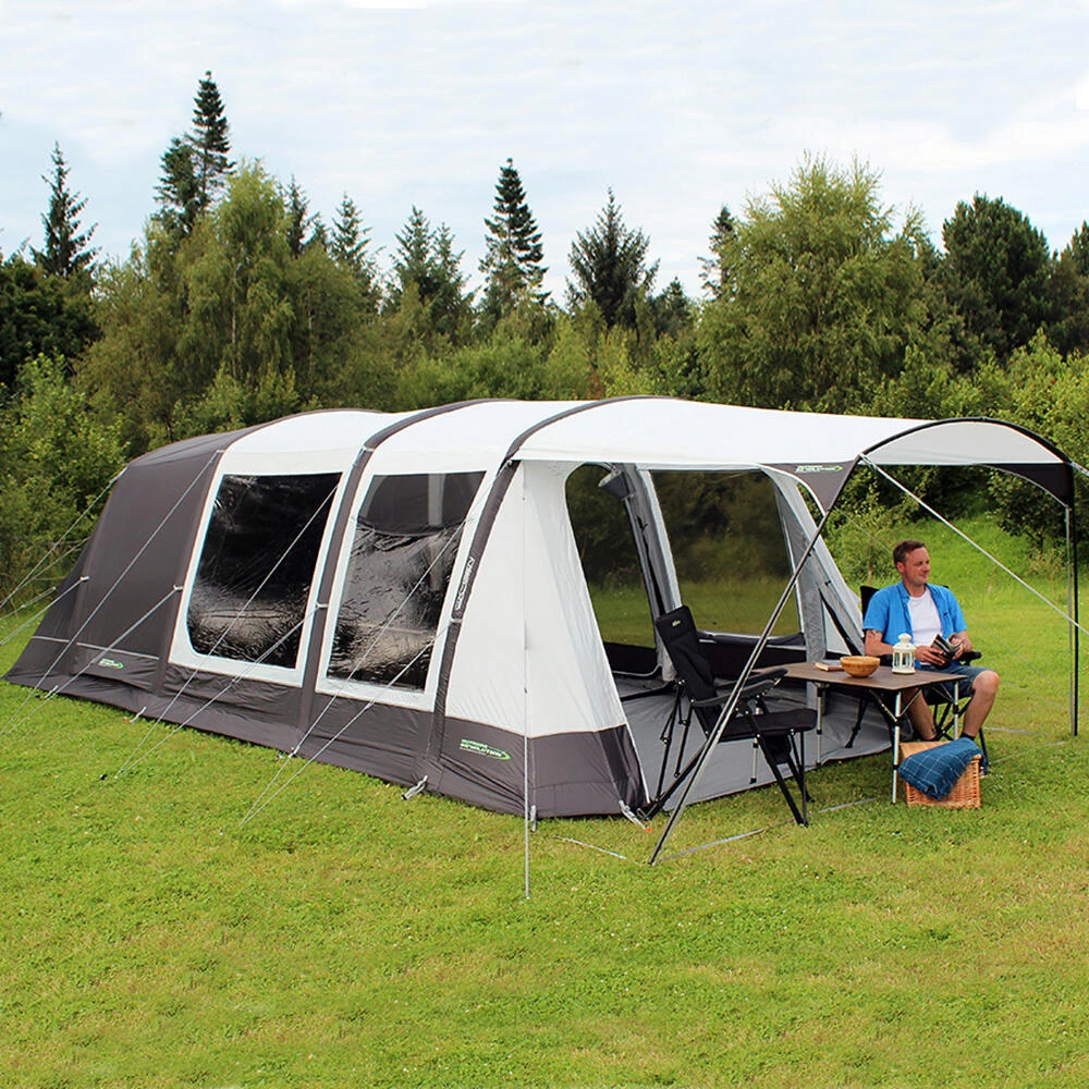Having received the critically acclaimed Best Compact Family Tent award from Camping Magazine in 2019, the lightweight five berth Airedale 5.0S inflatable family tunnel tent was always destined to become a firm family favourite and remains a key model in this range. Specifically designed to accommodate mid-sized camping groups seeking a base for memorable family camping adventures, or festival use. This high-spec family tent is the quintessential design for smaller families or couples craving a wealth of space, quality features, flexibility and protection against the elements, without a dramatic increase in pack size, weight or price. Ventilation and airflow are of key consideration in all of our family tents, which is why we have introduced a new double width patio-style side door with a zip-back phoenix mesh ventilation fly screen panel, helping to consistently maintain a comfortable internal temperature whilst keeping bugs out. Now with the option to add an attractive zip-on Sun Canopy the Airedale 5.0S is a fantastic, high-quality tent for couples and small families. • 240 HDE high density all weather lightweight fabric