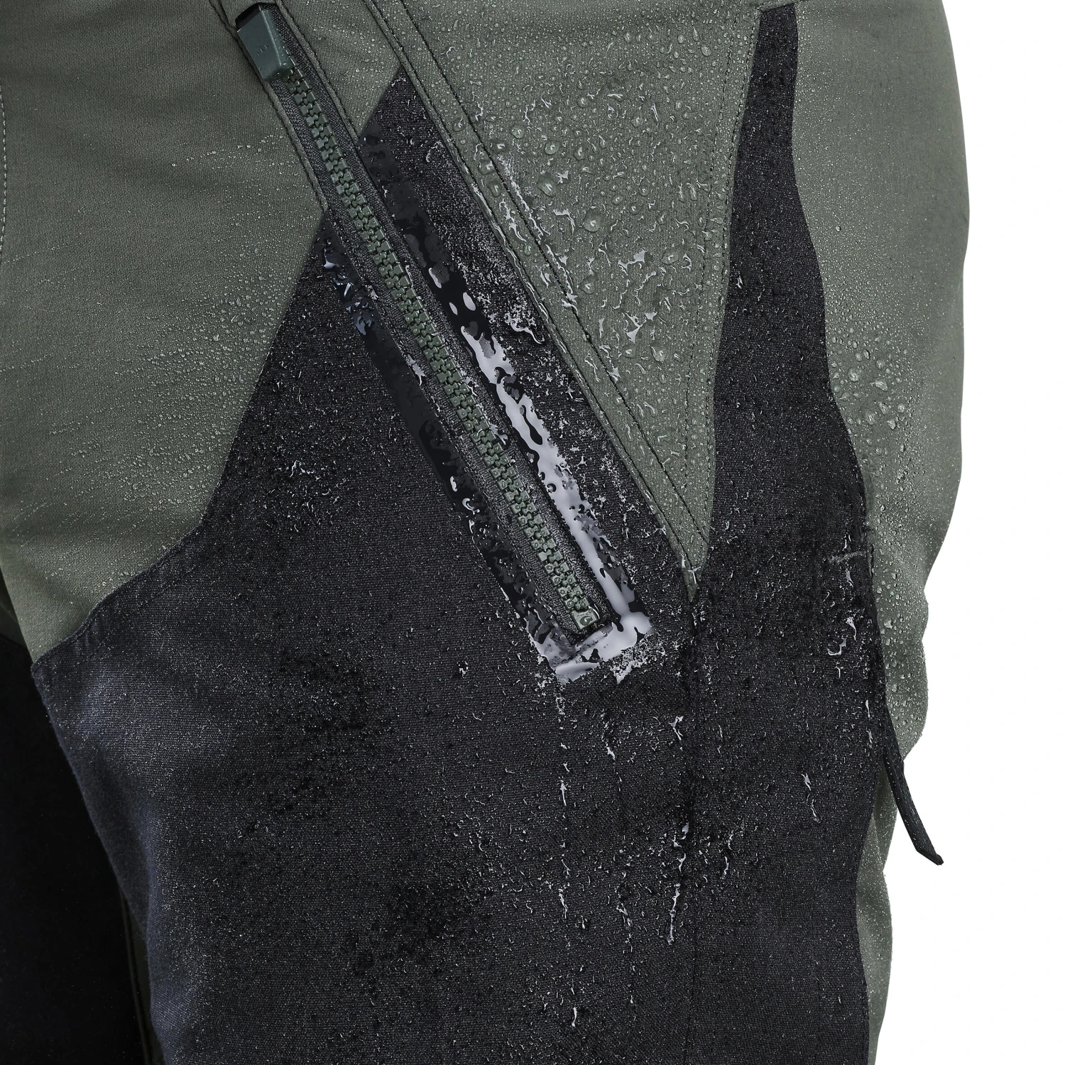 Lower legs reinforced with 269.2 g/m² Dynamonous by Toray (93% Polyester, 7% DuPontTM Kevlar®) up to the crotch for higher puncture and abrasion resistant against vegetation in hostile environments “DuPontTM and Kevlar® are the property of subsidiaries of DuPont de Nemours, Inc.”