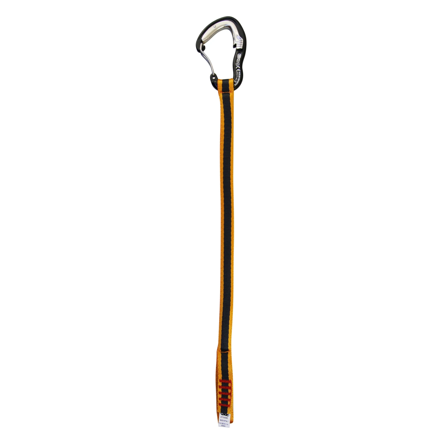 The Panic quickdraw consists of a 45 cm strap with a rod inside to create rigidity.At the top is a carabiner with an ingenious mechanism allowing the gate to remain open and close on contact with the anchor.