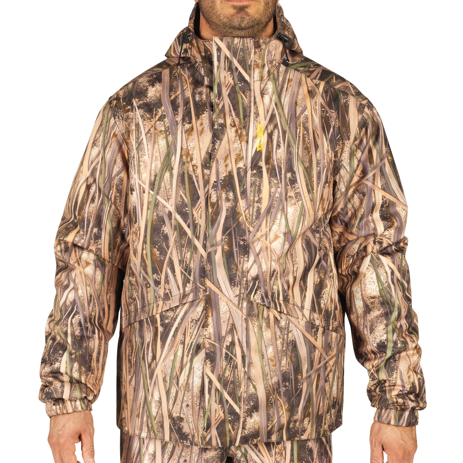 This hunting jacket has the exclusive SOLOGNAC wetlands camouflage pattern, designed for better camouflage in the eyes of waterfowl such as geese, ducks and teals. With its ultra-realistic pattern of vegetation (rush, grass, reeds), a distinct 3D effect, a realistic foreground and a background with contrasting light and dark shades, this jacket lets you blend into any type of undergrowth, by day and at dusk.