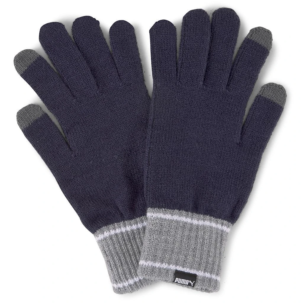 Knit gloves with touch-screen function on thumb and index finger of both hands. Striped cuff in contrast color. Embroidered Cat Logo on back of the hand
