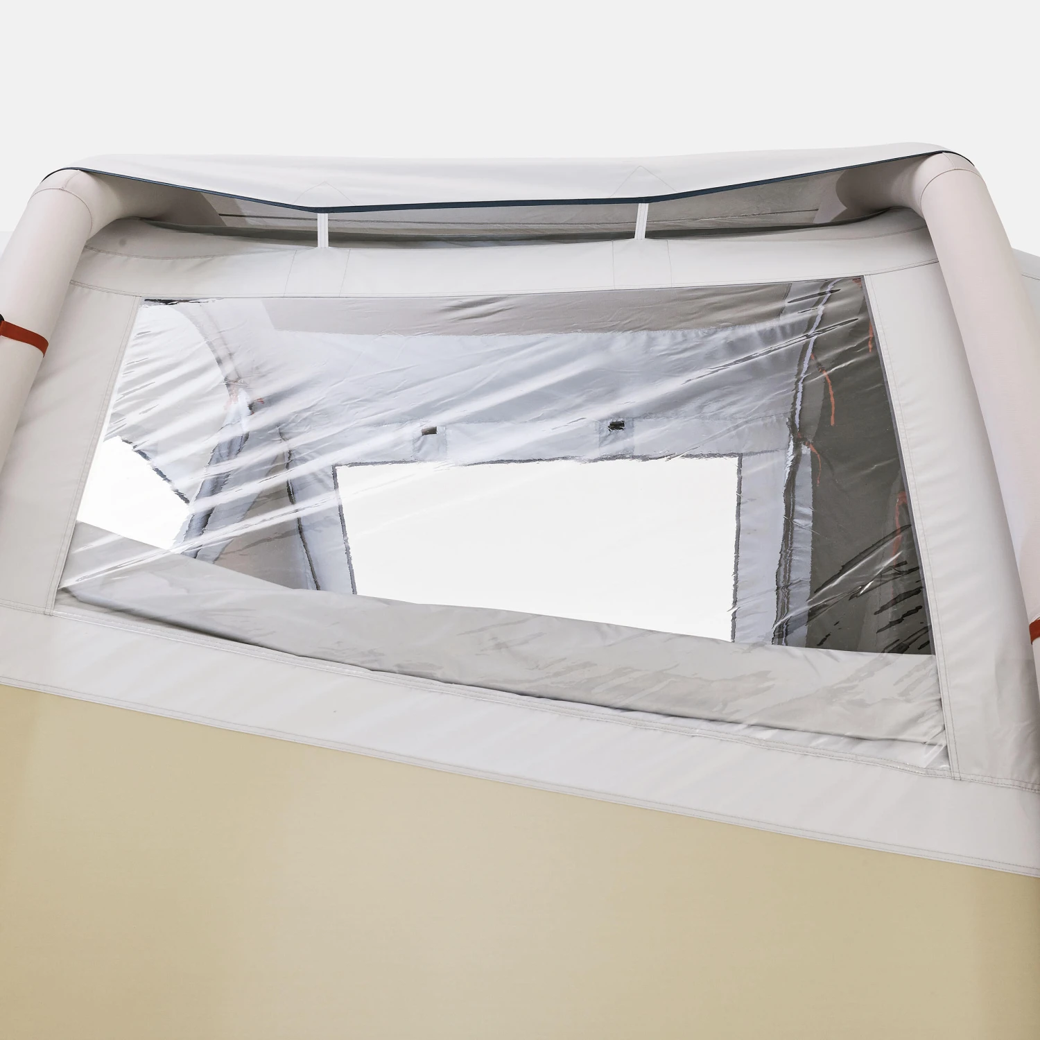 Inflatable all-in-one structure with pre-assembled bedrooms and flysheet.