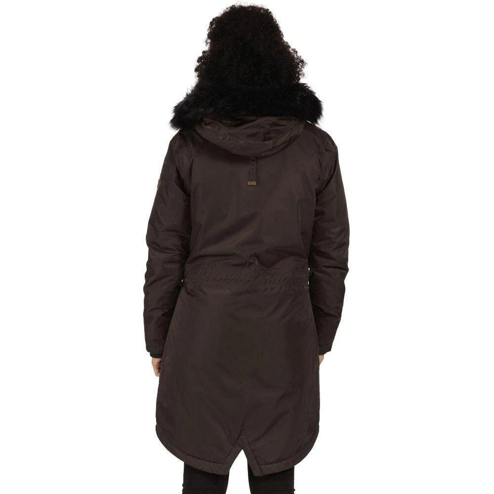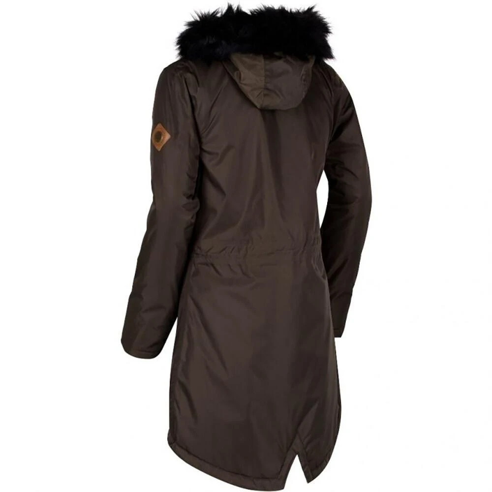 - The hood is trimmed with fine quality faux-fur (removable) and the waist tucks in with a drawcord fastening.
