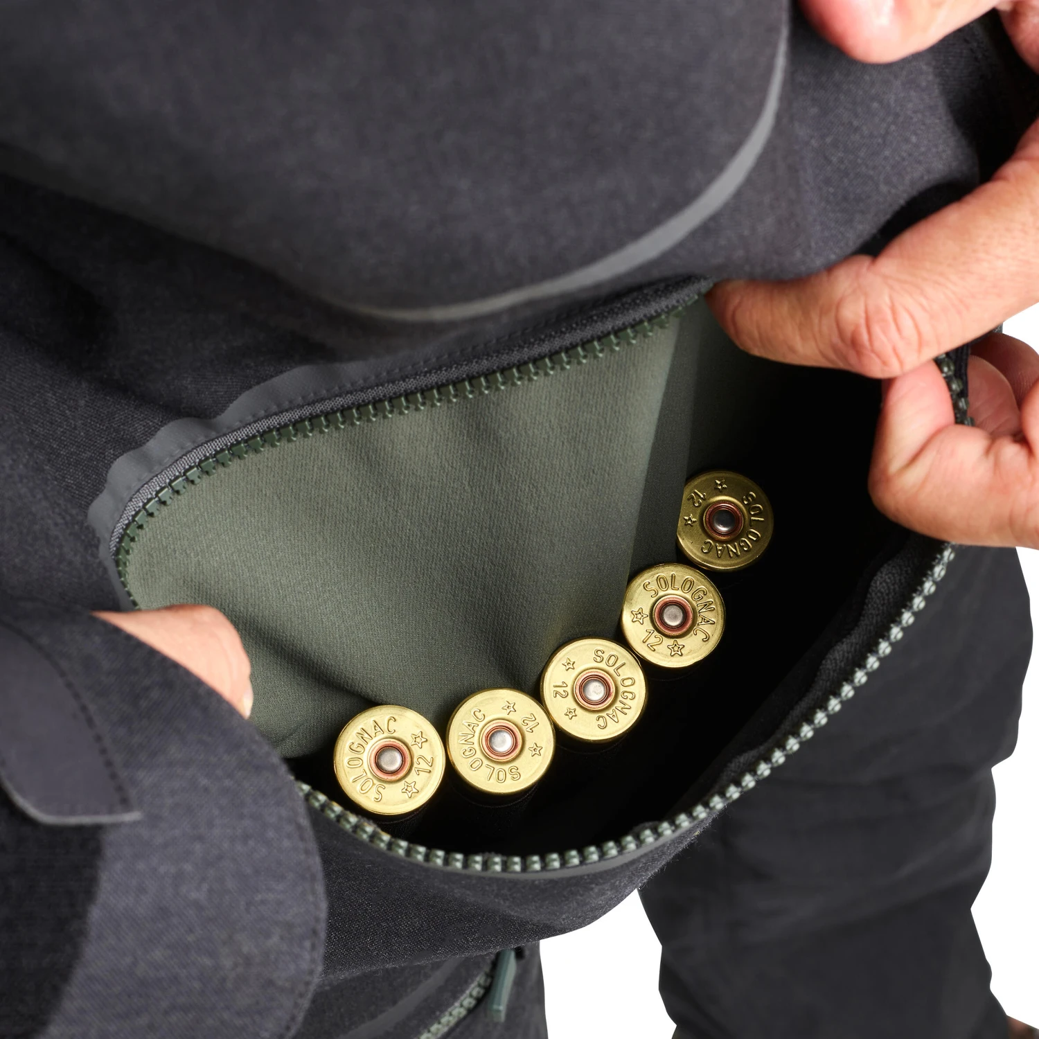 This jacket has 2 outer pockets which are zipped (with a blocking mechanism) for extra safety, and which are flattened to avoid vegetation getting in. Inside each of these pockets, you can store 5 cartridges, so you can carry 10 rounds of ammunition in these pockets. There are also 2 vertically-zipped pockets. Finally, a back notepad can be opened using 3 zips to transport your preferred game. It can be opened by these 3 sides to facilitate storage and cleaning.